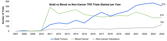 Oncology continues to be the most studied area in TPD, with 56% and 30% of the trials initiated in 2024 investigating solid and haematological cancers, respectively. While both decreased compared to initiations in 2023, breast cancer and lymphoma remained the leading indications for solid tumor and blood cancer trial initiations.